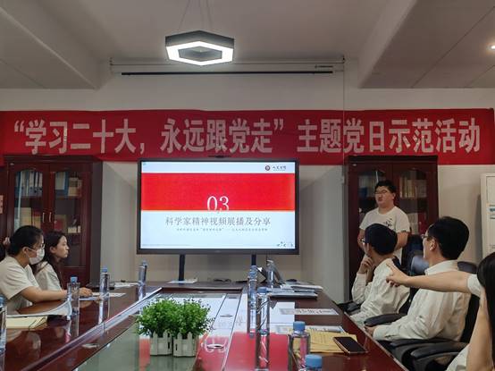 会议第一项,参会成员共同欣赏本科传播党支部“重走榜样之路——交大人物志”系列作品,从中感受伟大的科学家精神。作品包含《罗忠忱》、《茅以升》、《林同炎》、《陈能宽》,在视频播放中,周松同志和杜建辉同志代表小组向大家分享了制作微党课时的感受与收获。