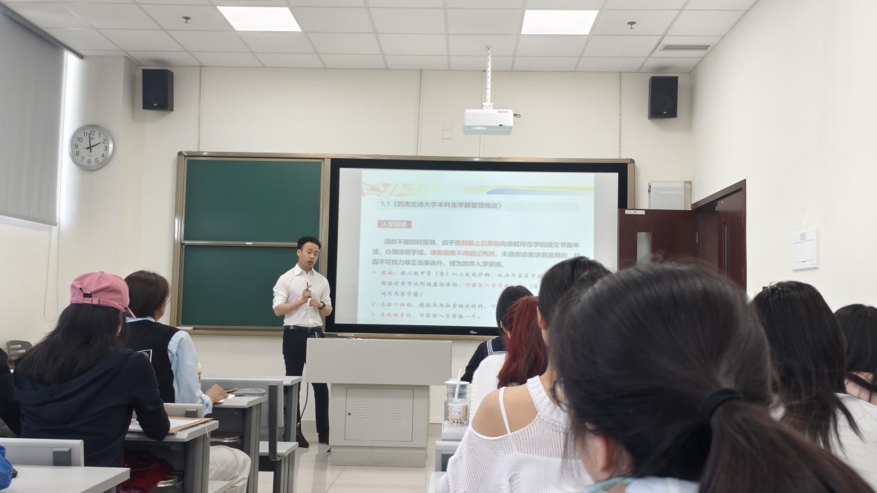 党课第三讲,郭立昌同志首先介绍了相关校纪校规、法律法规,从《西南交通大学本科生学籍管理规定》、国家安全教育和大学生法制教育三个方面讲述了作为交大本科生应遵守的规章制度,作为新时代青年应该遵守的法律法规,让同学们领悟不仅要将法律法规铭记于心,更要做到知行合一。