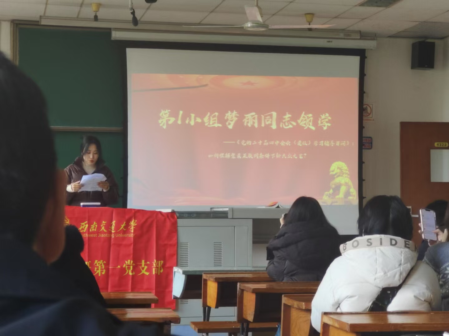 研第一党支部于九里校区J4322教室组织开展12月主题党日活动,围绕《党的二十届四中全会〈建议〉学习辅导百问》进行专题学习。本次活动由满珍明同志主持,研第一党支部全体成员参与。