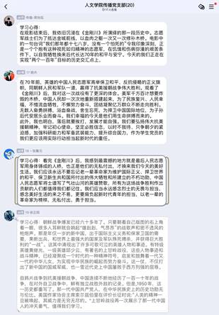 张晓芸同志谈到:“战争是残酷而无情的,回顾历史也伴随着对战争的反思。忘记历史等于背叛,铭记历史的意义之一在于珍惜和平。抗美援朝战争中,中国在军备条件不占优势的情况下顽强作战,打赢了这场战争,为新中国在国际上立足做出了巨大的贡献,让全世界都看到了中国人的精神与力量,看到了中国军队的顽强意志与军事能力。这场战争打出了国威、军威,打出了中华民族的自信心。在电影结束正片结束后,大家并没有立刻离开,而且静静地坐在座位上,直到最后迎接烈士遗骸归国的片段播放完毕,在这场战争中,有无数的英雄在异国他乡长眠,为和平献出生命,而今生活在和平年代的我们更应该牢记历史,珍爱和平,反对霸权主义强权政治,实现真正的和平稳定发展。”