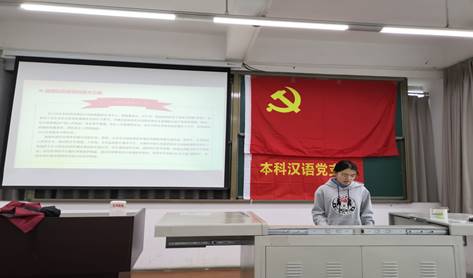 2020年11月5日下午16:00,本科汉语党支部在X8215教室召开会议,按照学校党委“读党史、学党史、知党史”的活动通知,选取自读资料,认真学习了《抗击新冠肺炎疫情的中国行动》白皮书、《习近平关于统筹疫情防控和经济社会发展重要论述选编》和《中国共产党的九十年》,重温我们党从成立以来,为中华民族和人民群众建立的不朽功勋,感受2020年新冠肺炎疫情期间我党所做出的巨大贡献。本次读书会系列专题二由支部的三个领学小组逐一进行读书汇报,并由支部成员展开研讨交流。会议由本科汉语党支部书记刘晗悦同志主持。