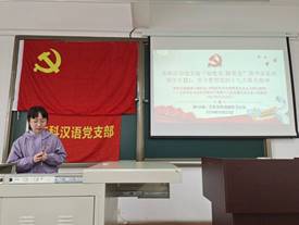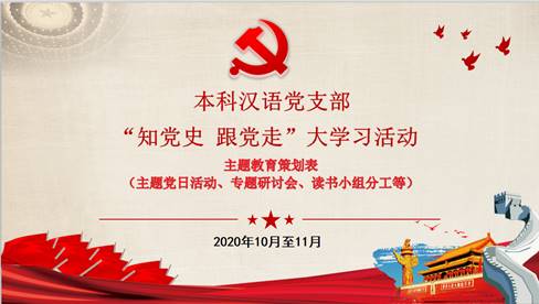 本科汉语党支部根据学校与学院党委的部署要求,自10月中旬起开展了以党史、新中国史、改革开放史、社会主义发展史为主要研习内容(以下简称“四史”),以理论联系实际为形式的“知党史、跟党走”主题教育活动。支部成员通过读党史、学党史、知党史,在中共百年奋斗的光辉历程中领悟共产党人的初心和使命,切实增强“四个意识”、坚定“四个自信”、做到“两个维护”的思想自觉、政治自觉、行动自觉。