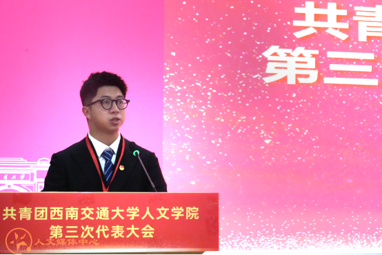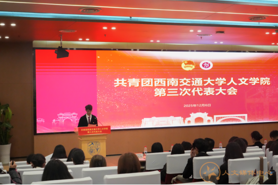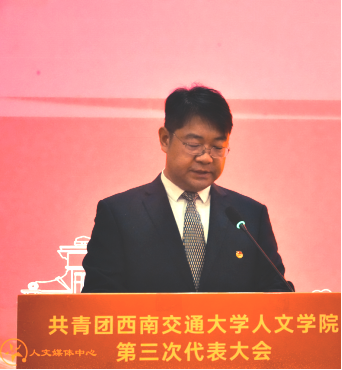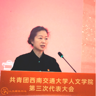 党委书记罗妍妍代表学院党委向大会召开表示祝贺。她指出,在学院团委积极构建“五个一”思想引领体系、推动“五育并举”与“思政+专业+实践”的深度融合下,团组织的凝聚力与战斗力持续增强。近年来,学院团委获评“西南交通大学五四红旗团委创建单位”,学生在国家级、省级竞赛中屡获佳绩。院团委在社团建设、网络思政、实践育人等方面的丰硕成果,充分展现了人文青年昂扬向上的精神风貌。面向未来,罗妍妍代表学院党委对新一届团委和全院团员青年提出四点要求:一是坚定理想信念,做爱党爱国、胸怀天下的时代新人;二是锤炼过硬本领,做勤学善思、知行合一的实干先锋;三是勇于开拓创新,做敢为人先、追求卓越的奋斗标兵;四是牢记服务宗旨,做心系同学、甘于奉献的青年骨干。她希望新一届团委会团结带领全院青年,为学校和学院高质量发展注入蓬勃的青春动能。